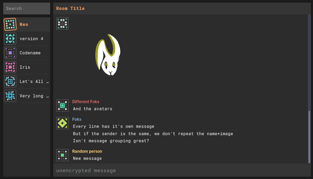 Neo is still in the GUI component design stage (the best stage to get involved with feedback!). I have implemented the jdenticon library for avatars, autoscrolling when there are new events, and I've added the Rust code of conduct. https://git.lain.haus/f0x/iris