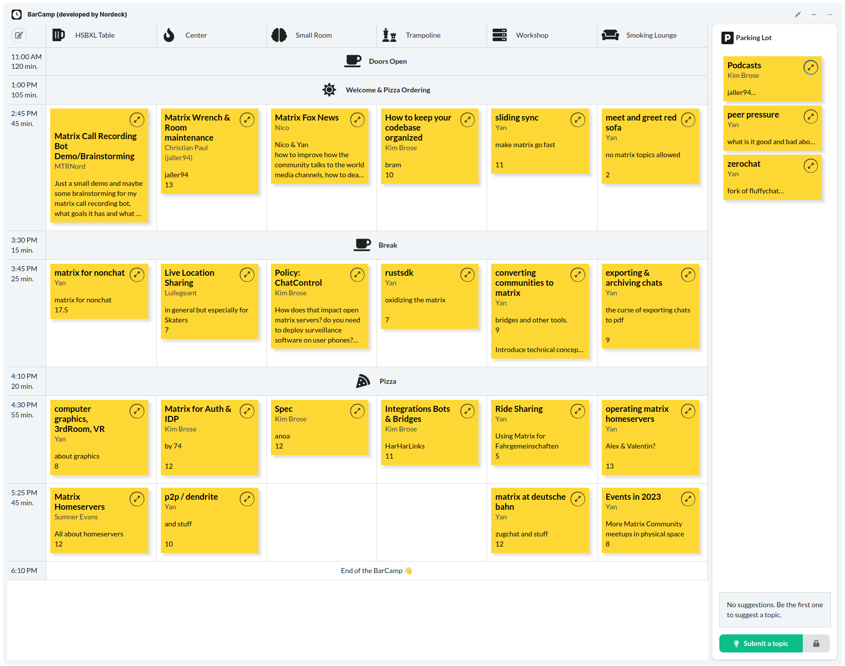 While we expected the need for everyone to just meet and exchange their ideas, we still wanted to provide a framework for things to get going. After a "quick" introductory round of everyone presenting themselves and their connection to Matrix, constantly expanding the circle around the table as more people kept pouring through the pink gate, we built a timetable of topics from the introduction using the BarCamp Widget developed and slightly modified for the physical BarCamp use case by Nordeck.
