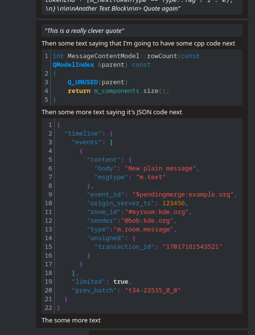 • Improvements to message rendering, most notably with amazing syntax highlighting for code blocks (also implemented by James)