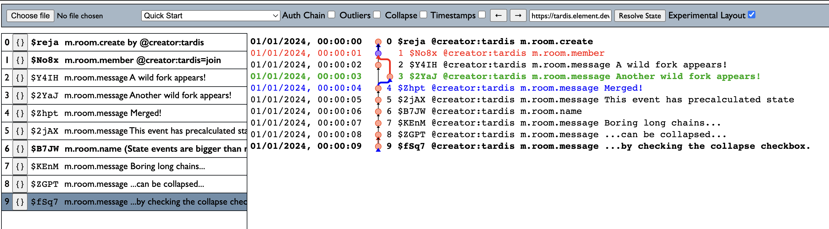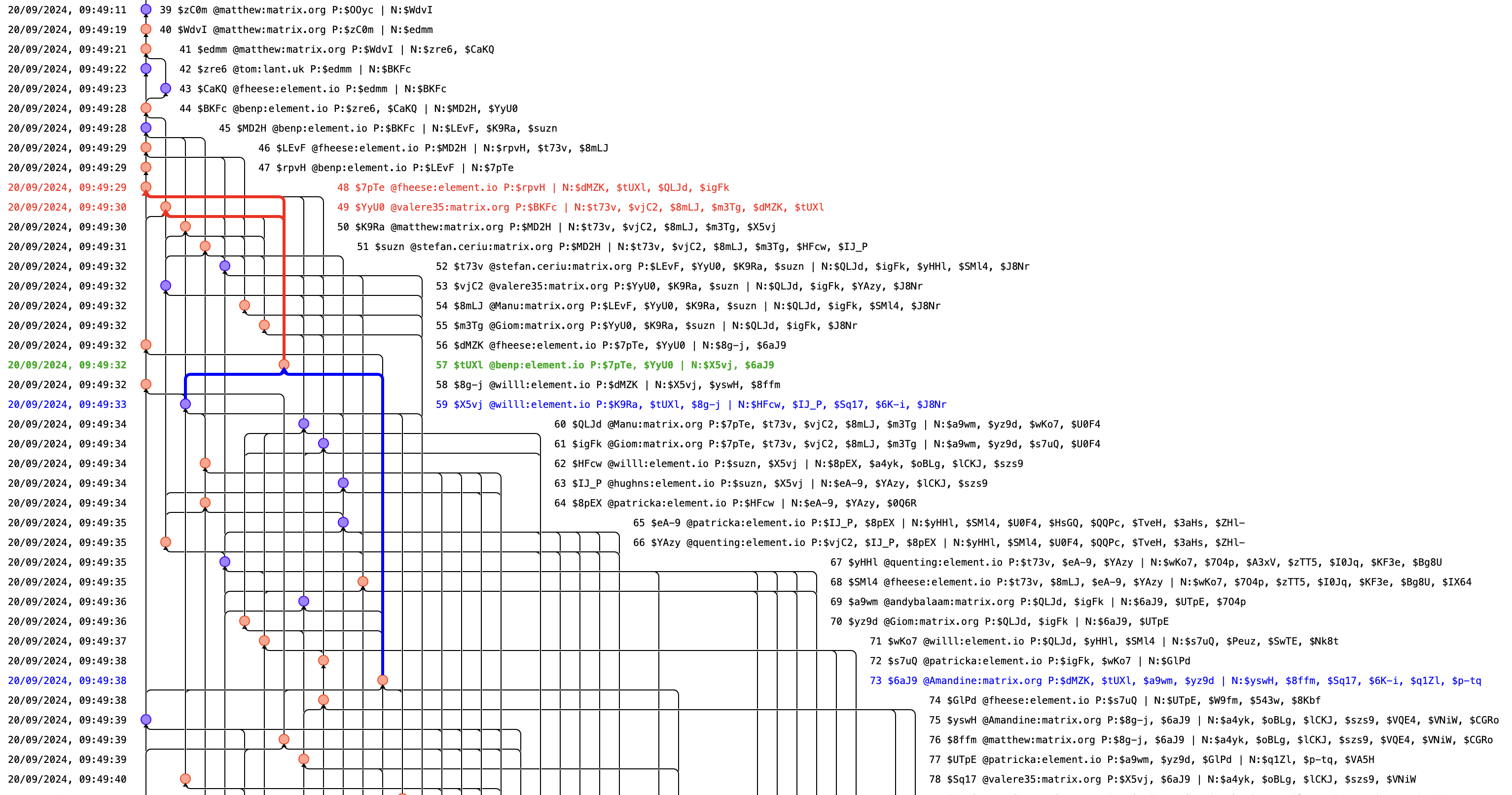 I wrote a new experimental DAG visualisation layout algorithm for TARDIS, loosely based on git-style 'tramline' branching visualisations. It can handle massively complex DAG structures, useful when debugging exotic state resolution problems or fork-proliferation problems.