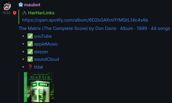 Do people sometimes share links to music with you on Matrix? They do for me. Often, people use Spotify as their music streaming service, but I don't have Spotify.