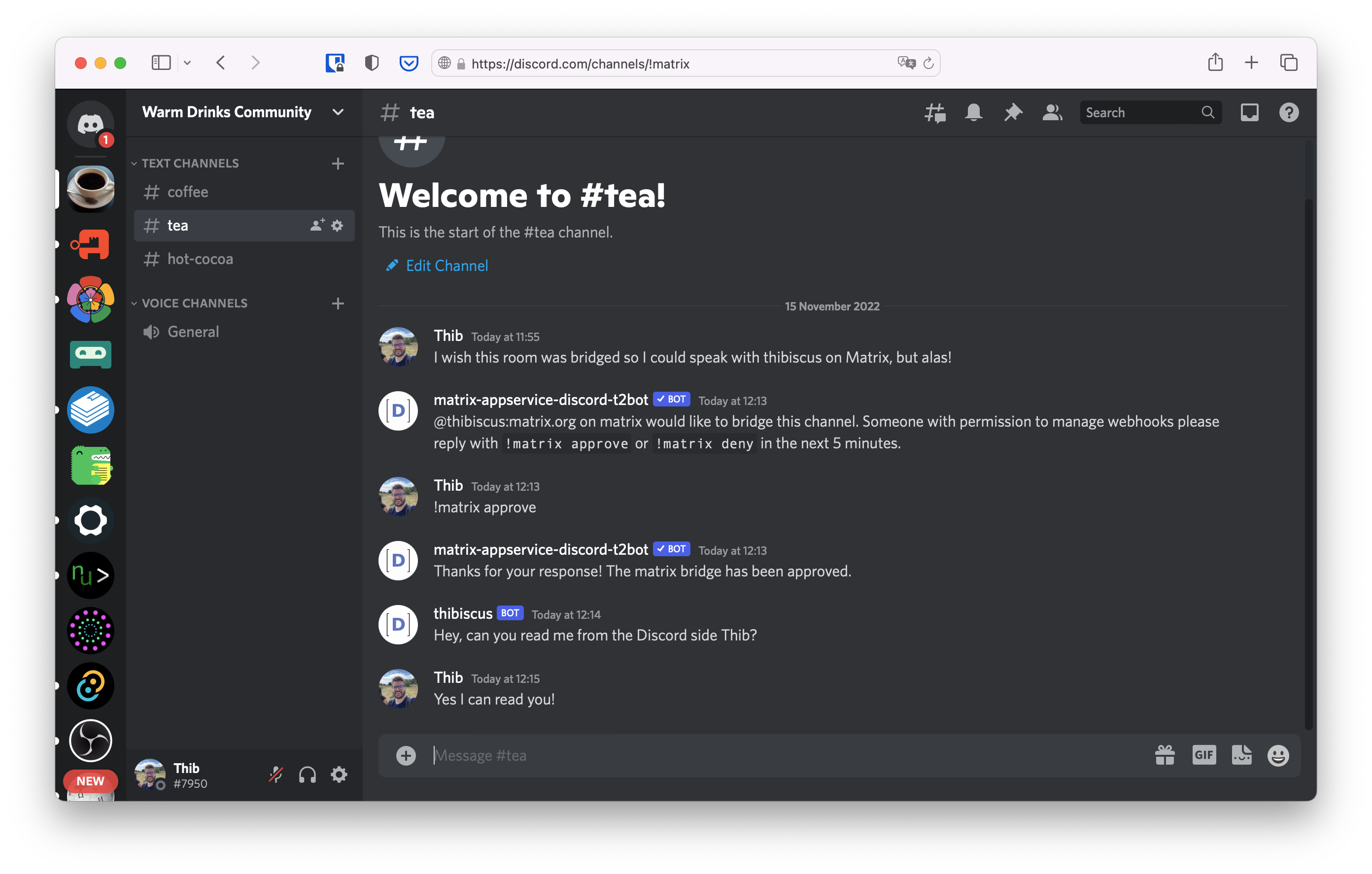 Here you can see a bridged room from the Matrix and the Discord perspective.